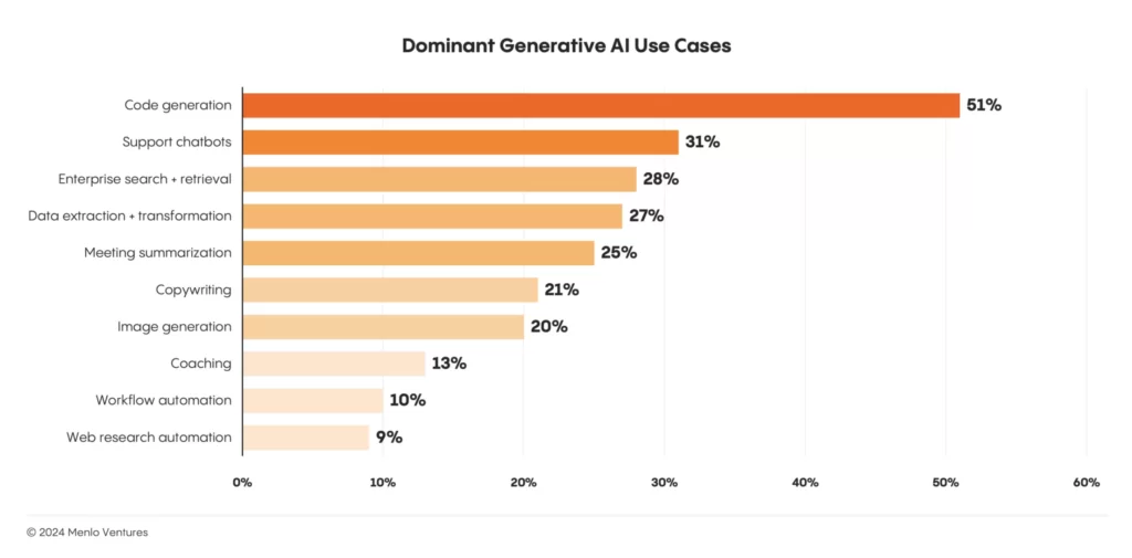 Menlo Ventures just released an interesting report on The State of Generative AI in the Enterprise. The stand out number is that the enterprise market went from spending $2.3B on generative AI in 2023 to $13.8B in 2024 – an over 6x increase in a single year.
